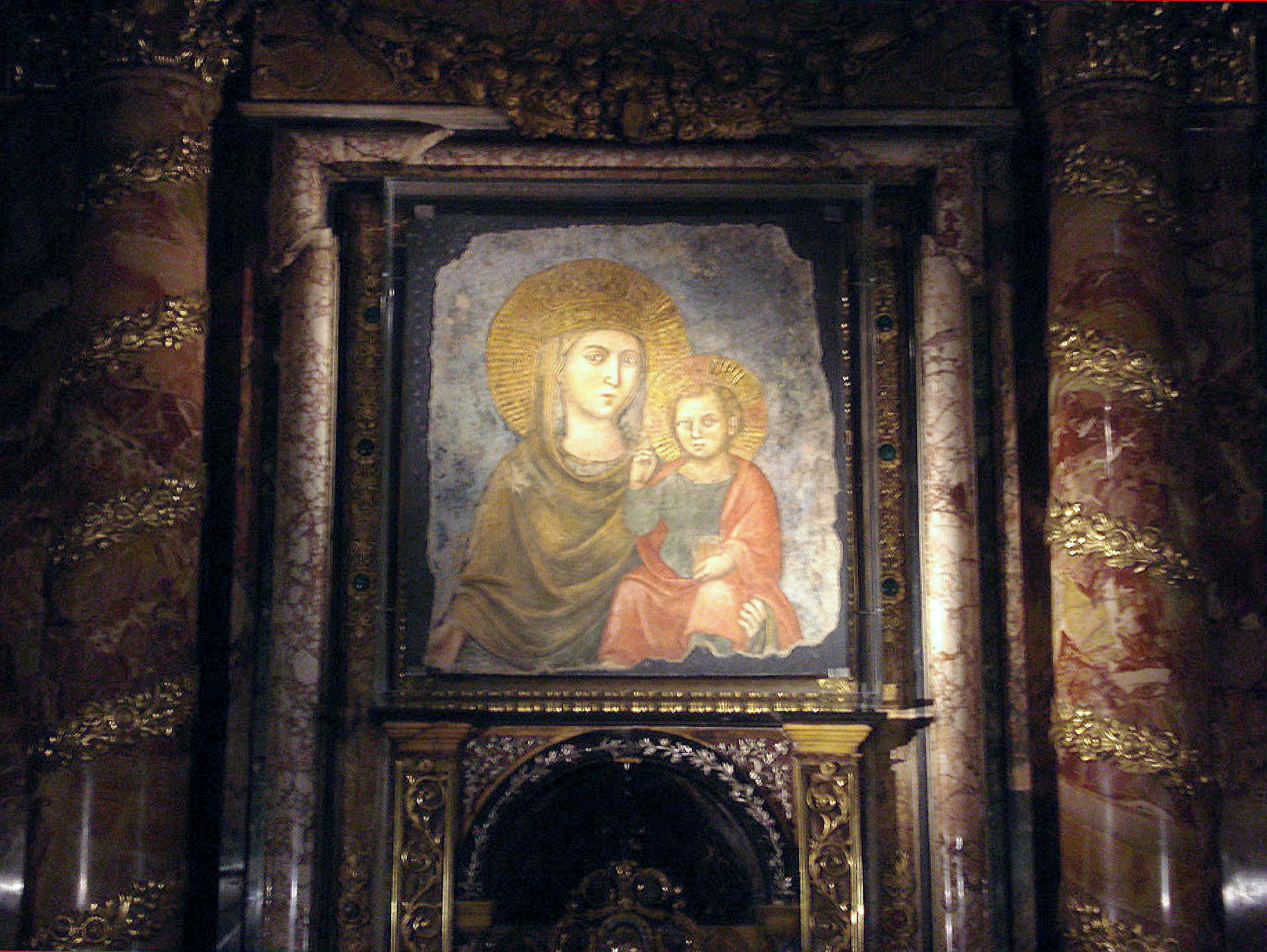 The name derives from a venerated 13th century icon from the façade of a now lost church in the piazza Altieri. The icon, now over the altar, was venerated by St. Ignatius. The image was cleaned and restored in 2010.