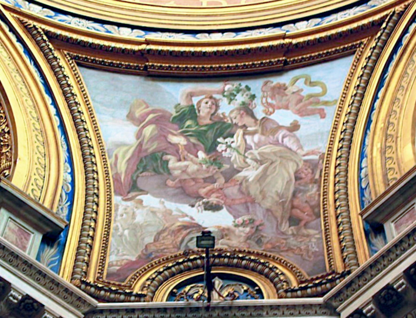 The four large dome pendentives display frescoes (1668-1671) showing Allegories of the four Cardinal Virtues. They are the first frescoes executed by Giovanni Battista Gaulli, known as Baciccia.