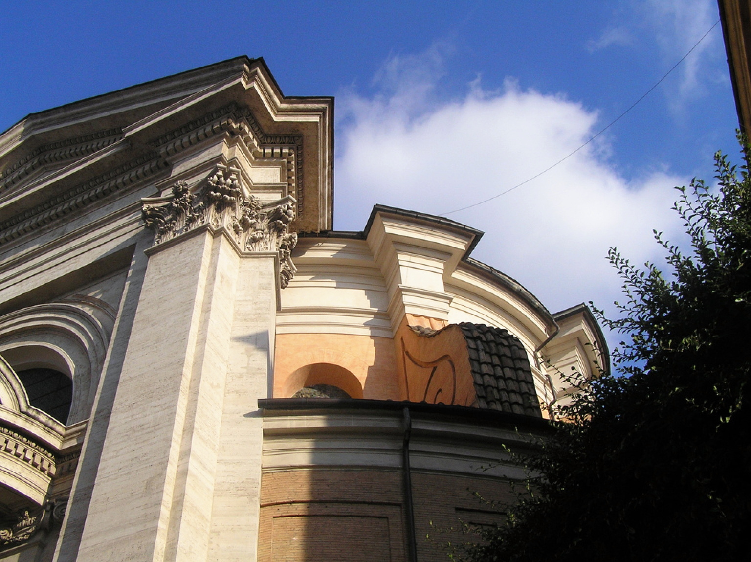The church consists of two ellipses: one larger in which the chapels are decorated, and one smaller covering the main room. The two ellipses can be seen from the outside, where the largest and the lowest of these ends with a slight slant, the smaller and the higher one rising with eight windows between the broad and flat, powerful buttresses that end with a wide entablature that carries the roof with the large center dome.