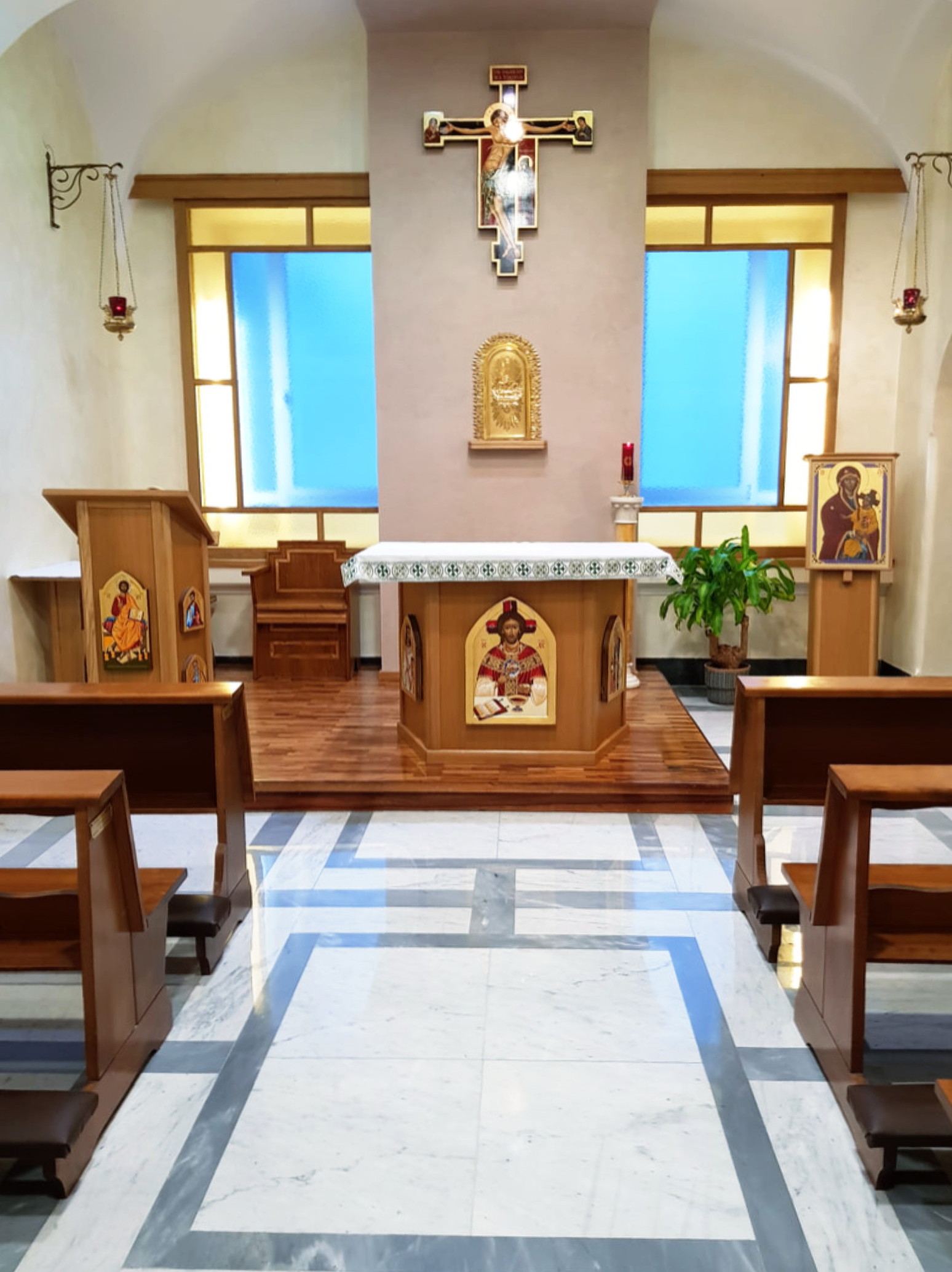 Above the tabernacle hangs a San Damiano Cross. There are a number of icons in this chapel. The small altar and ambo are also decorated with icons.