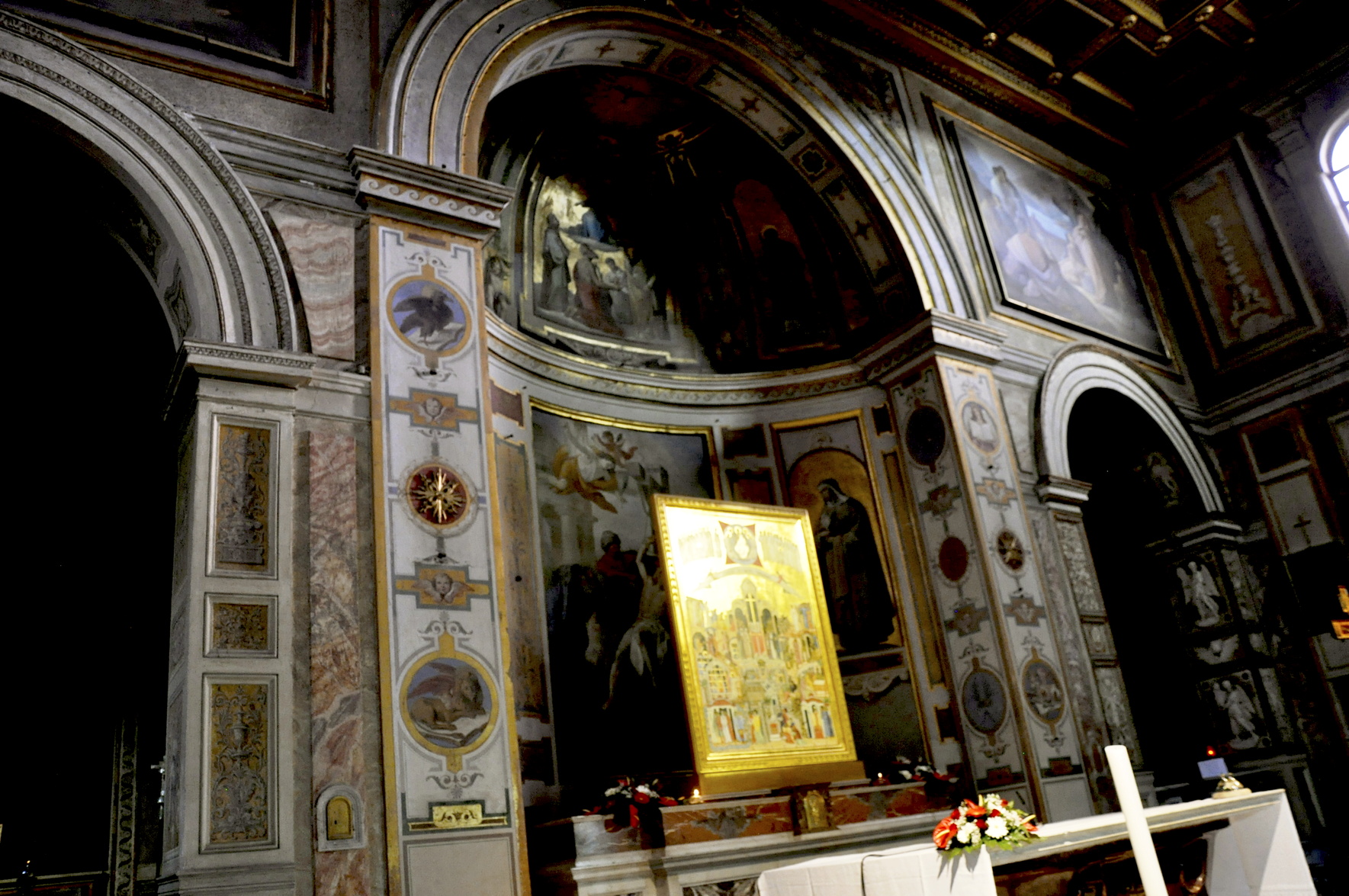 The transept and sanctuary are one architectural space. At the right end of the transept is the entrance to the Orsini Chapel, now the Blessed Sacrament Chapel. To the left of the sanctuary is the chapel of the Romanorum Molendinariorum or the Roman confraternity of millers.