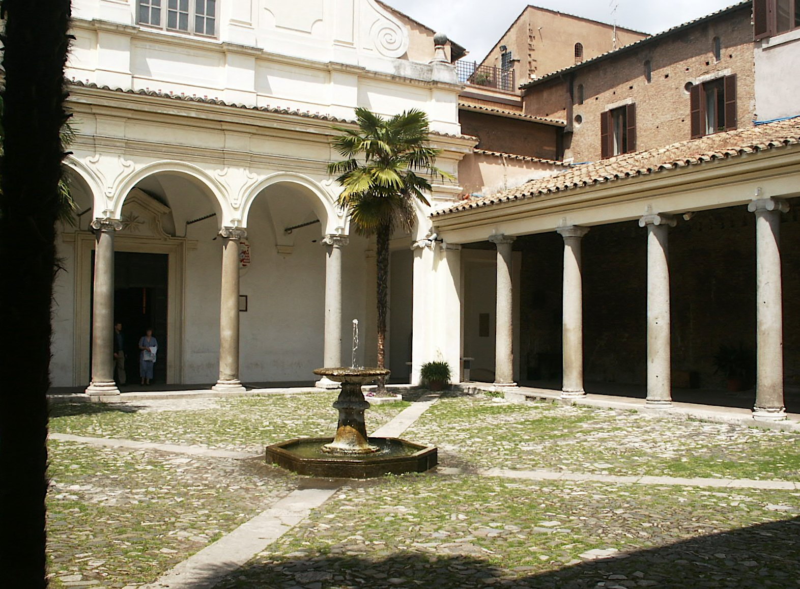 Atrium and colonnade with modern fountain in the middle.