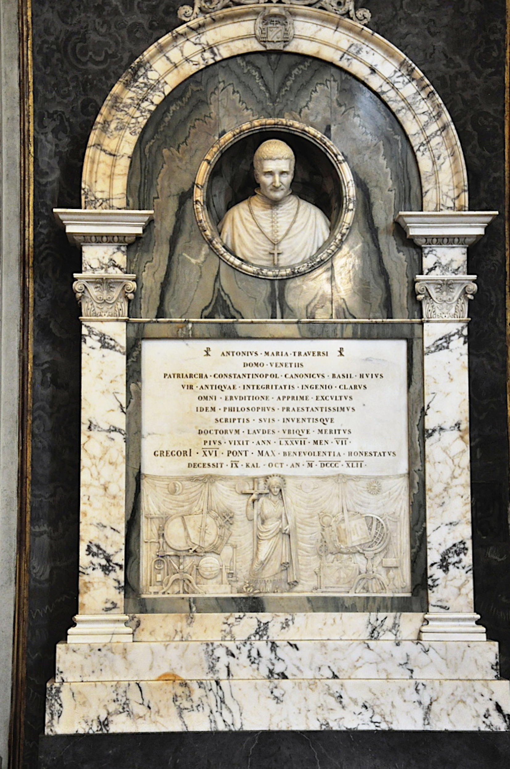 The next side wall niche contains a neo-Classical memorial to Antonio Maria Traversi (1842). He was the titular Latin Patriarch of Constantinople at the court of Pope Gregory XVI, but he was never a cardinal. He was extremely erudite in the arts and the sciences of the time, and the pope commissioned the memorial. As well as a bust, it has a tablet showing an allegorical figure of Religion between instruments associated especially with physics and astronomy. The monument was made by Giuseppe de Fabris.