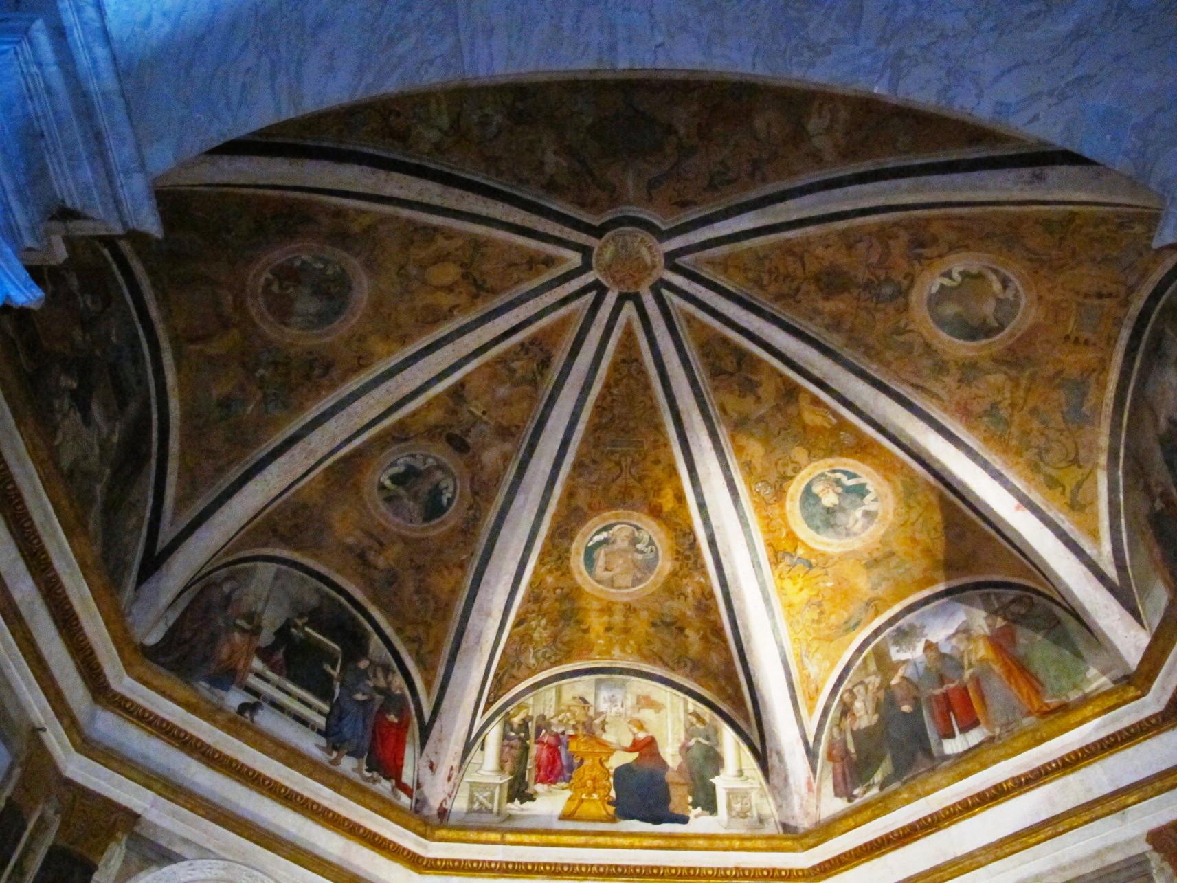 The five lunettes in the dome are decoreted with Stories from the Life of the Virgin, now much damaged and repainted. The lunette frescoes are: Birth of the Virgin, Presentation, Annunciation, Nuptuals and Visitation.
