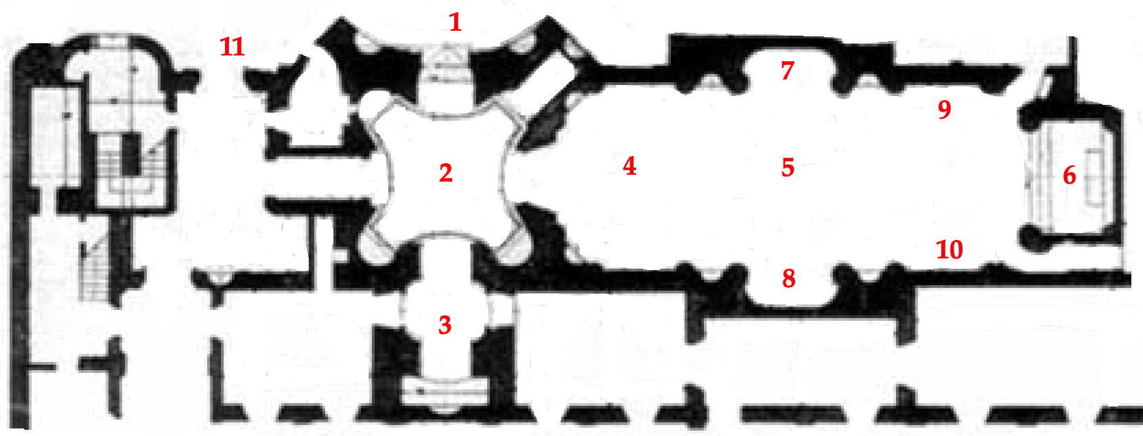The sanctuary is a transverse rectangle, narrower than the nave.