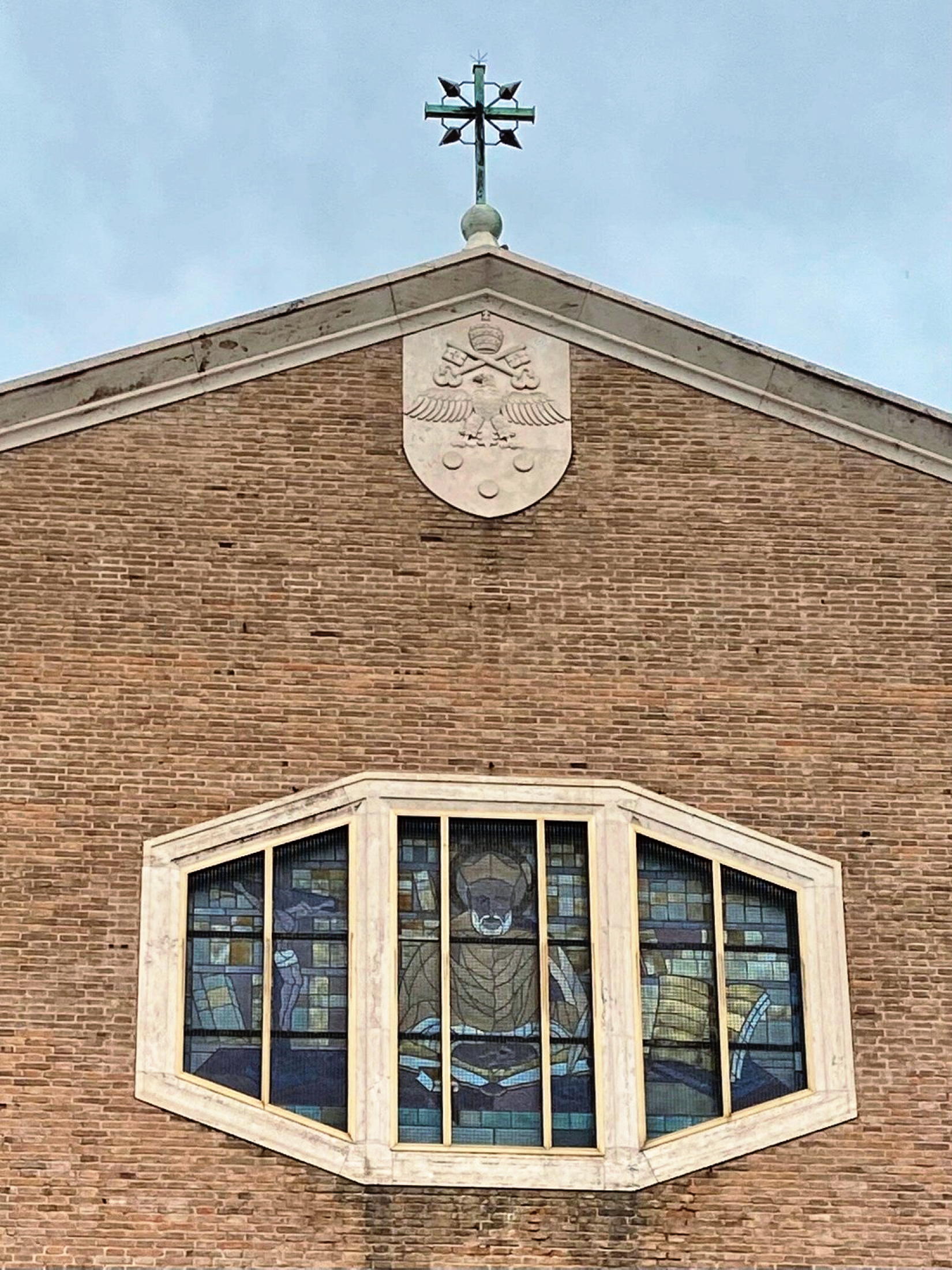 In the gable apex is a relief coat-of-arms of Pope Pius XI