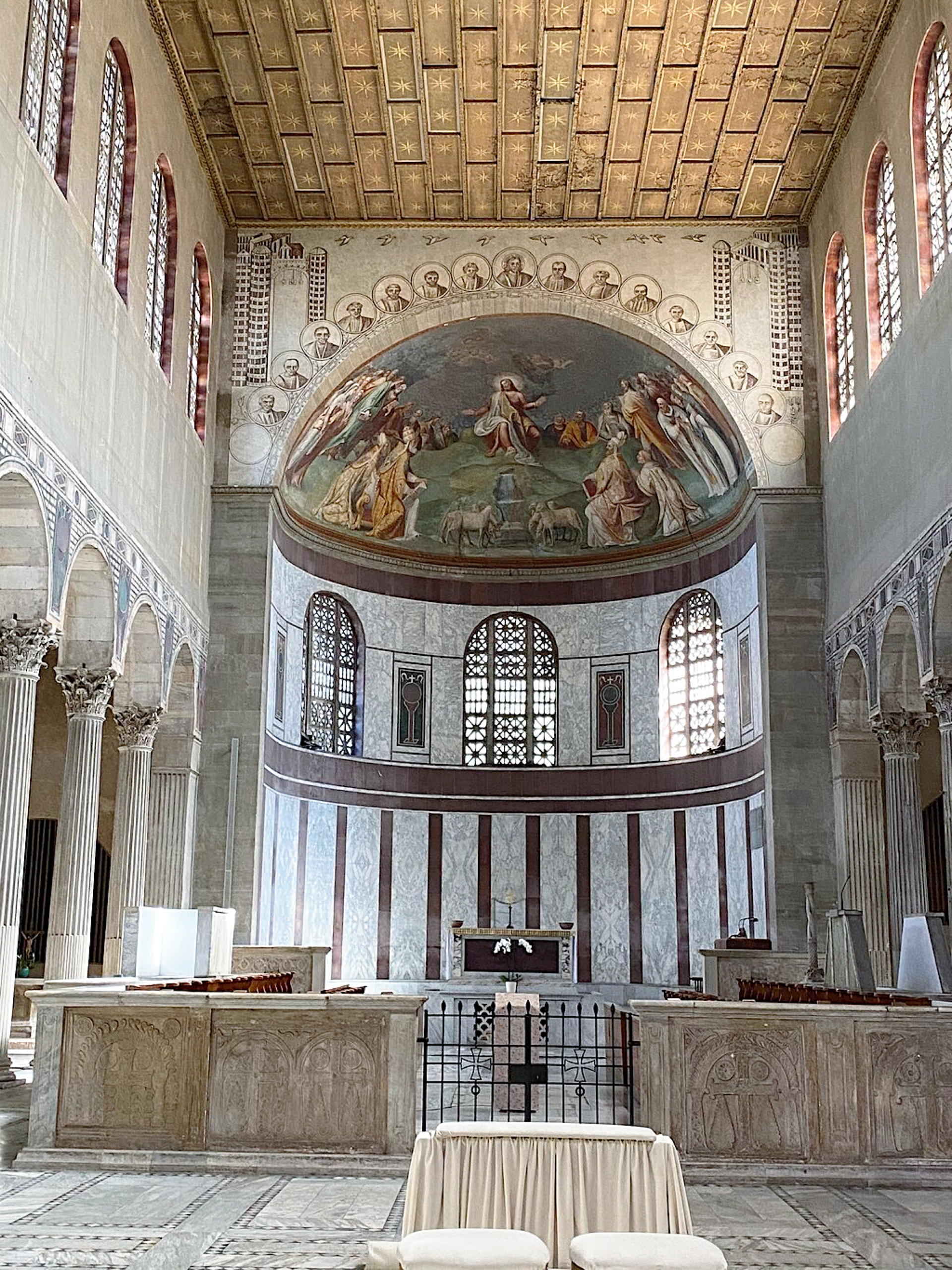 There is no apse mosaic, which is unusual in Rome for a church of this date. The apse was originally so decorated, as was its triumphal arch, but the mosaics have been lost.