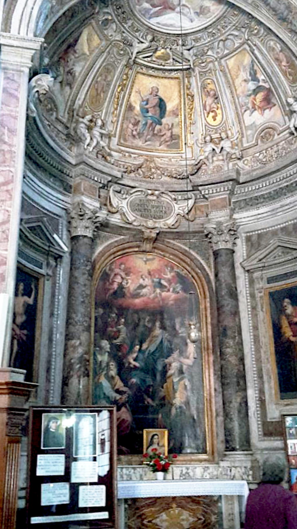 The first chapel to the right, commissioned by the Marchesa Vittoria della Tolfa, wife of Camillo Orsini and niece of Pope Paul IV. The architect was probably Ottavio Mascarino as it was constructed at the same time as the façade. The chapel must have been completed by 1588, the year on the inscription in the dado to the left, an inscription which was placed there by Theseo Aldovrandi, and the year on the memorial stone of Vittoria Tolfa, owner of the chapel.